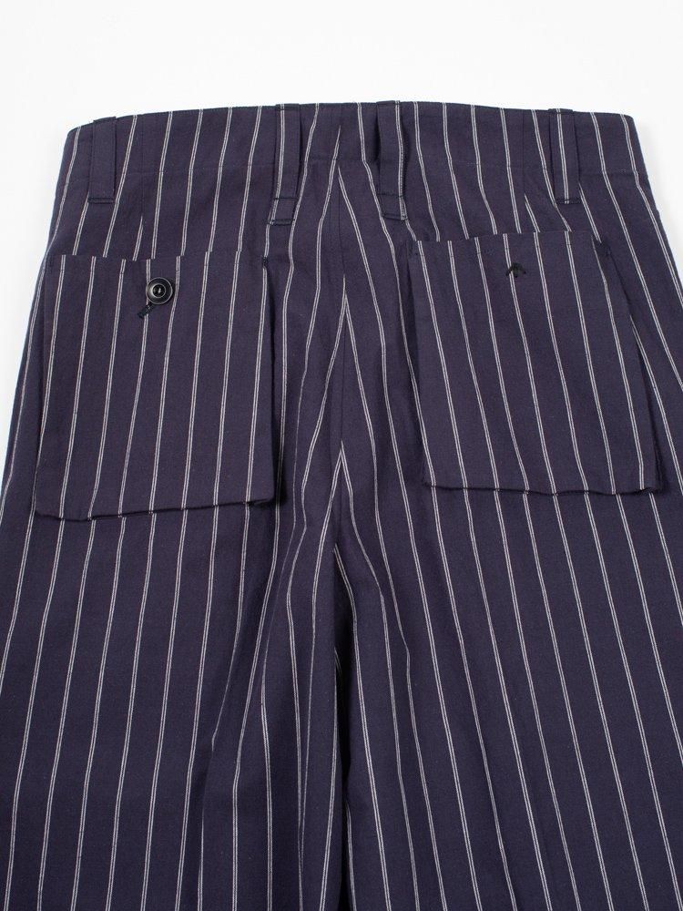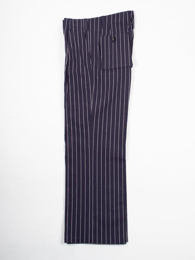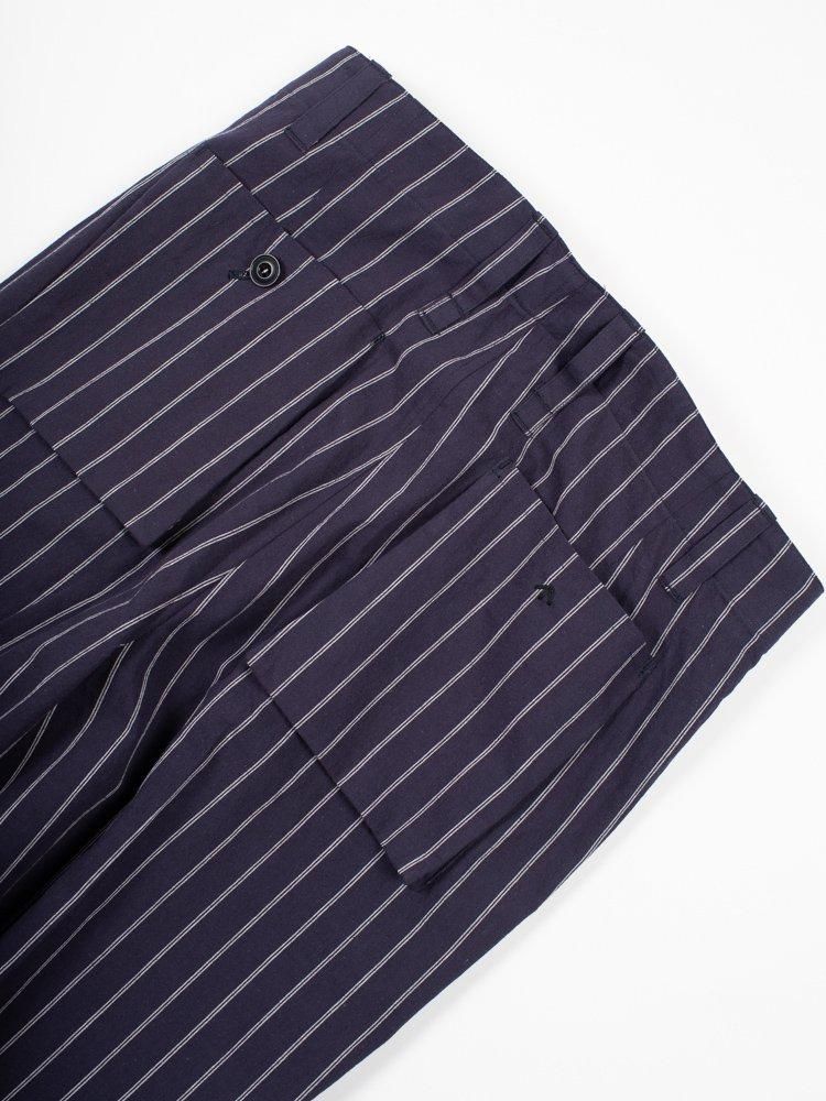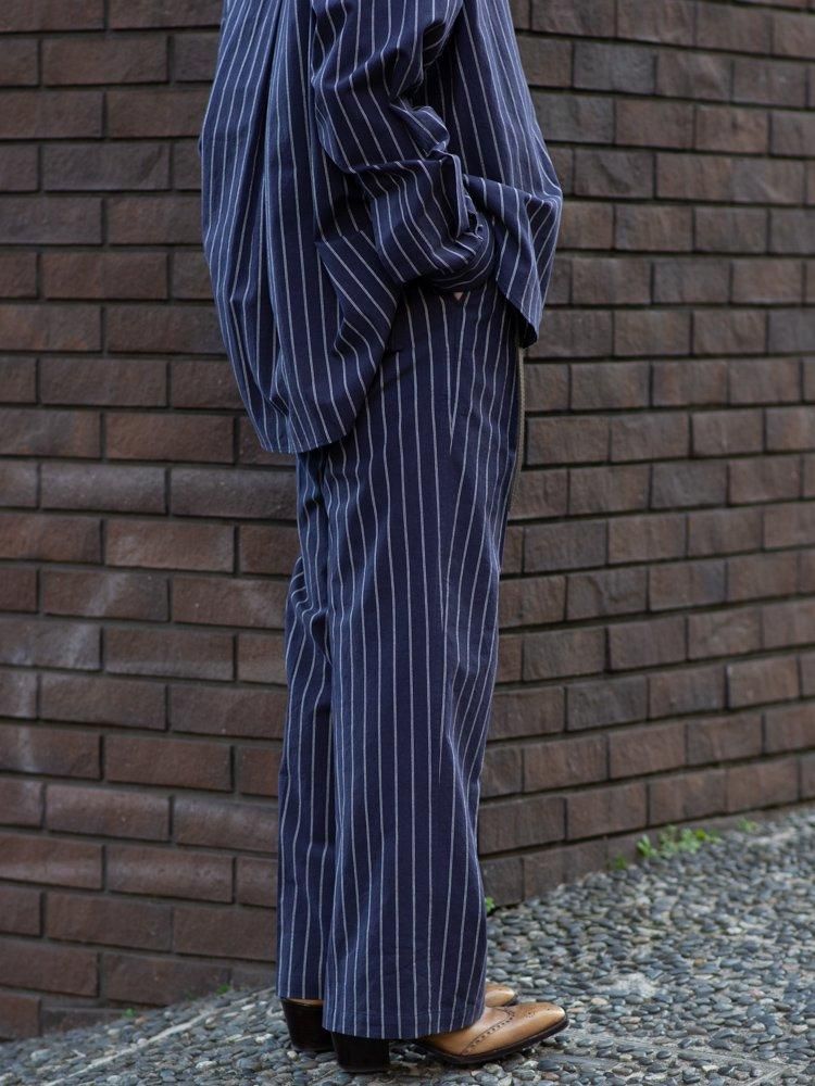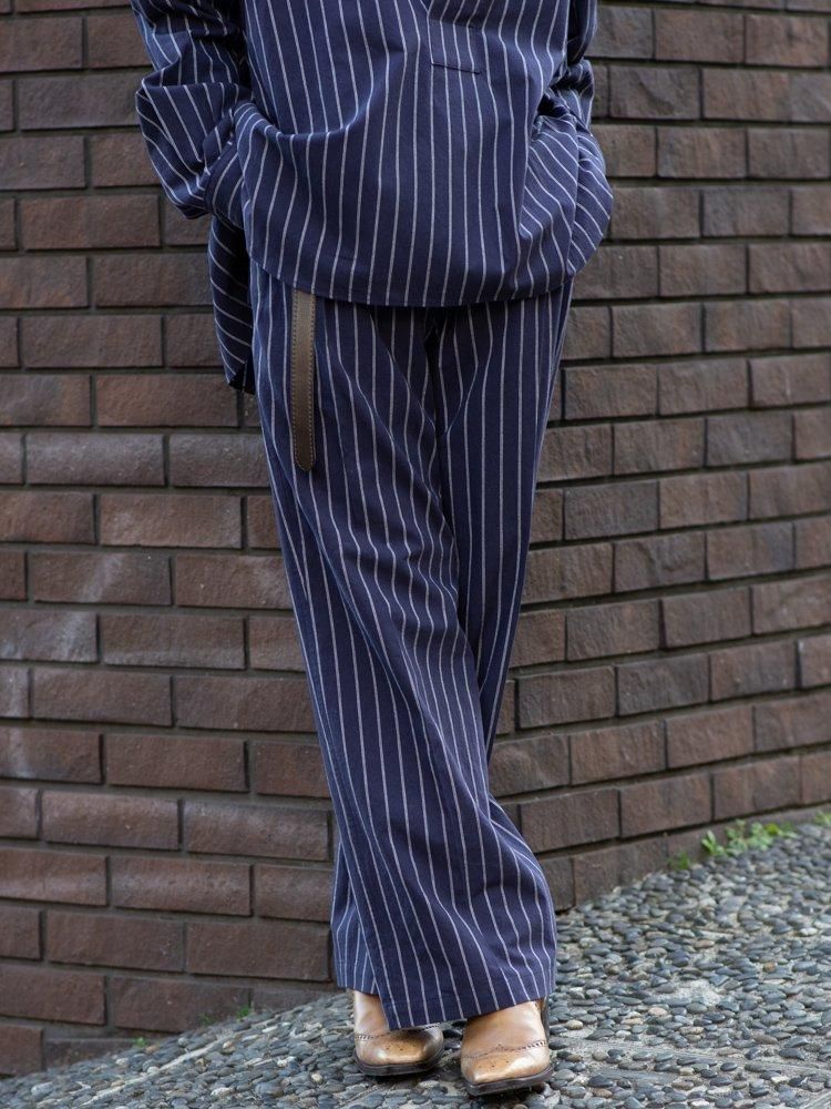 ブランド側解説:スキッパーシャツと同じコットンリネンのストライプ生地を使用したセミワイドスラックスです。