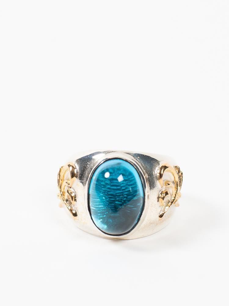 Legend(レジェンド)らしい唐草がサイドに配され、センターに大きくブルートパーズがセットされたリングになります。