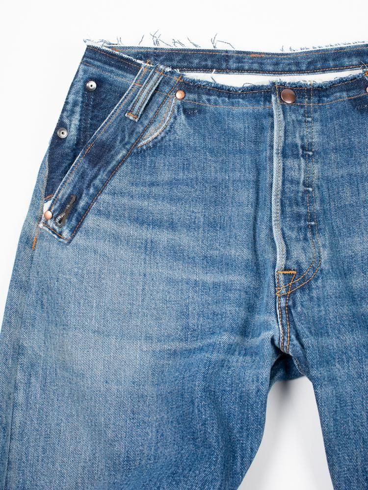後ろのバックポケットは両方取り、デニムのアタリを表に出し、右後ろは取ったバックポケット2枚を再利用し1枚のみ大きさを変えダブルポケット仕様。